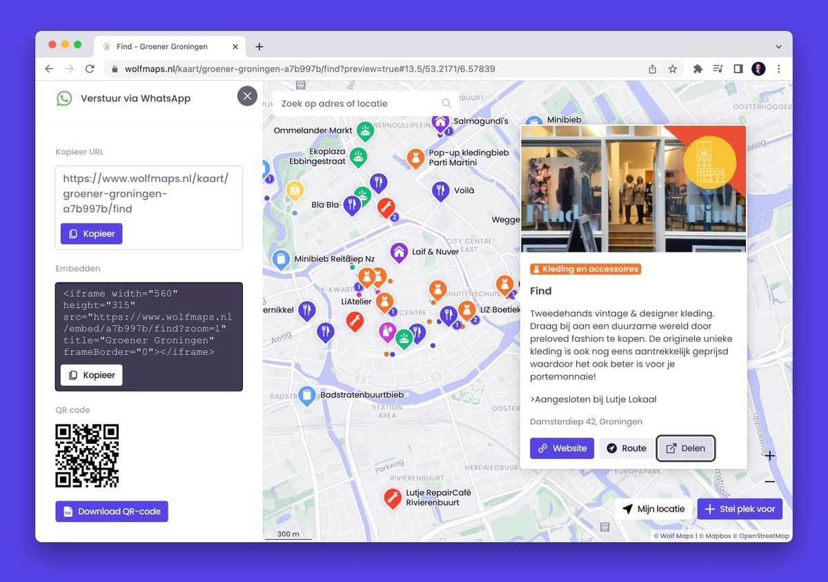 Groener Groningen maakt duurzame ondernemers en initiatieven meer zichtbaar in Groningen. Zij gebruiken de QR-codes uit Wolf Maps om stickers en posters te maken die winkeliers voor hun raam kunnen hangen. Voorbijgangers zien dan direct dat ze duurzaam bezig zijn en onderdeel zijn van een groen netwerk.