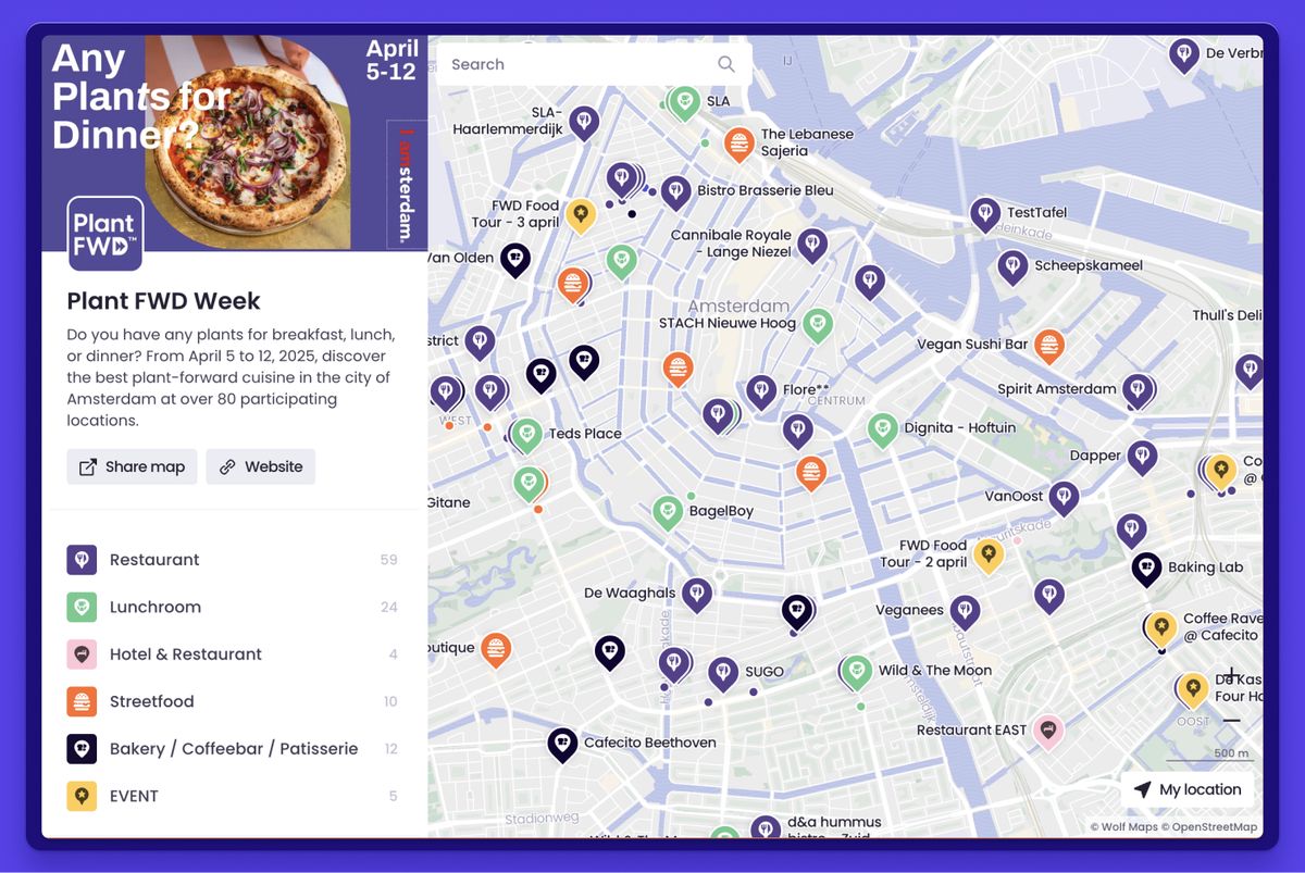 Neem de kaart van PlantFWD: een festival over plantaardig eten in Amsterdam. Alles op de kaart draagt bij aan dat ene thema, van locaties tot verhalen en sprekers. Dat maakt het voor bezoekers meteen helder: dit gaat over de toekomst van voedsel, en waar je die kunt proeven.