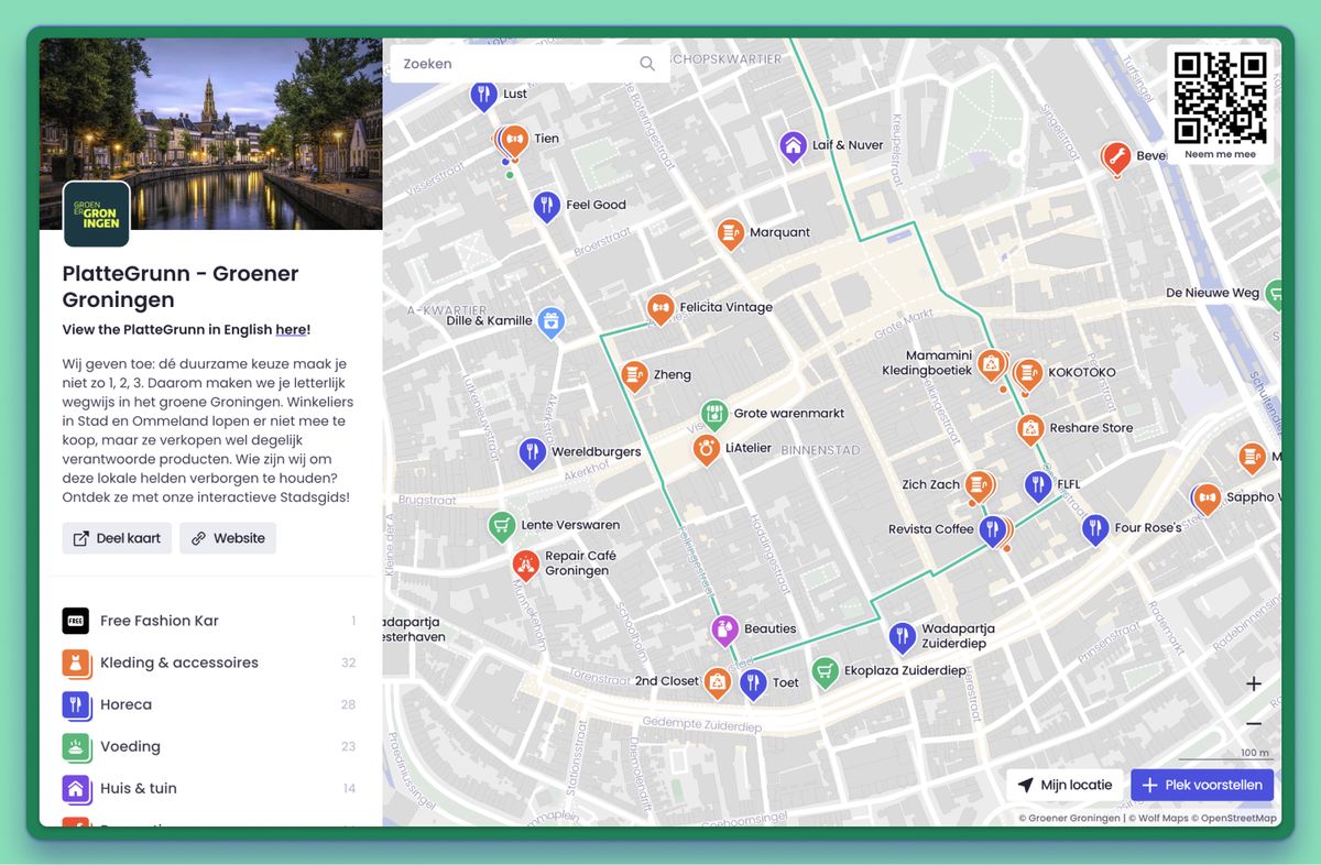 Een mooi voorbeeld: Groener Groningen. Hun kaart brengt duurzame locaties in de stad in beeld, speciaal voor inwoners die duurzamere keuzes willen maken. Denk aan tweedehandswinkels, energiecoaches of een lokale voedselcoöperatie. Die focus maakt het herkenbaar en bruikbaar.