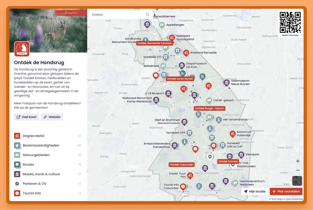 De Hondsrug doet dit goed. Op de hoofdkaart zie je de highlights van de regio. Maar als je verder klikt, kom je bij subregio’s met hun eigen verhalen, routes en beleving. Eén kaart als landingsplek, de rest als verdieping.