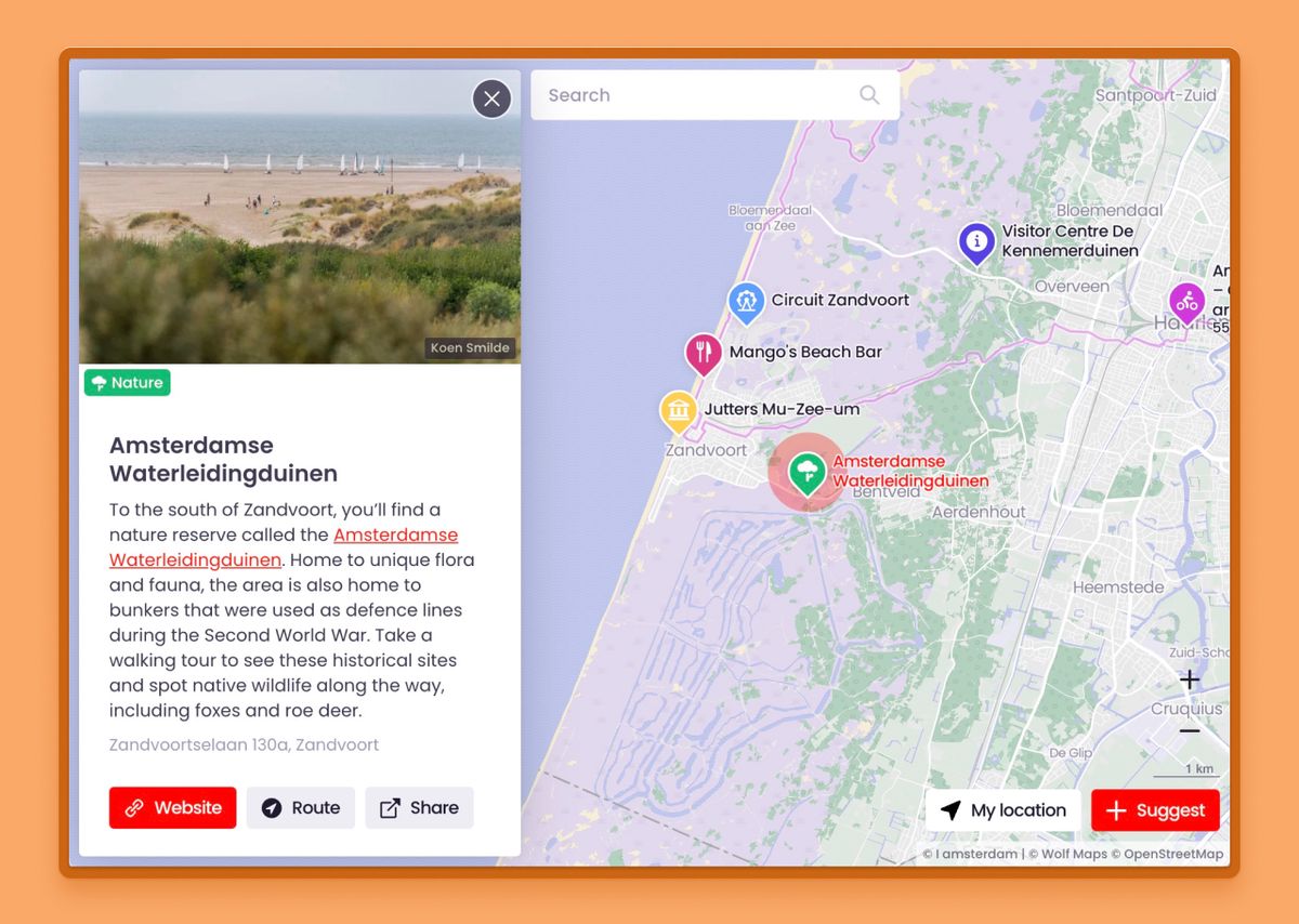 Side panel in Wolf Maps.Bijkomend voordeel is dat de kaart bruikbaar blijft wanneer er een locatie geactiveerd is. Een mooie verbetering en een opening voor veel nieuwe mogelijkheden. We’re proud ✨.