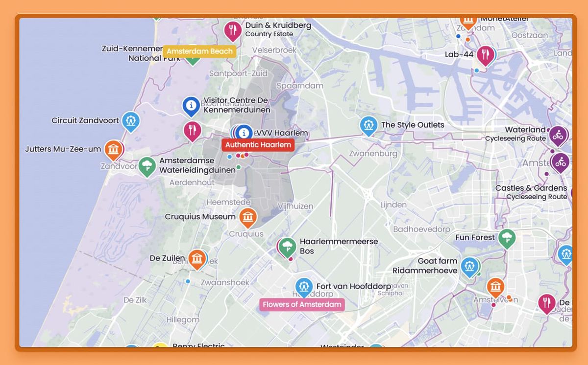 Map by MaatschapWijA visitor deserves to enjoy everything the surroundings have to offer without limits. Sometimes multiple maps emerge for areas, parks, or locations that are close together. Some providers – such as Amsterdam Area – choose to link maps together to strengthen one another and to broaden their area marketing efforts, while still allowing visitors to use your individual map. After all, a good neighbor is better than none… well, you get the idea.