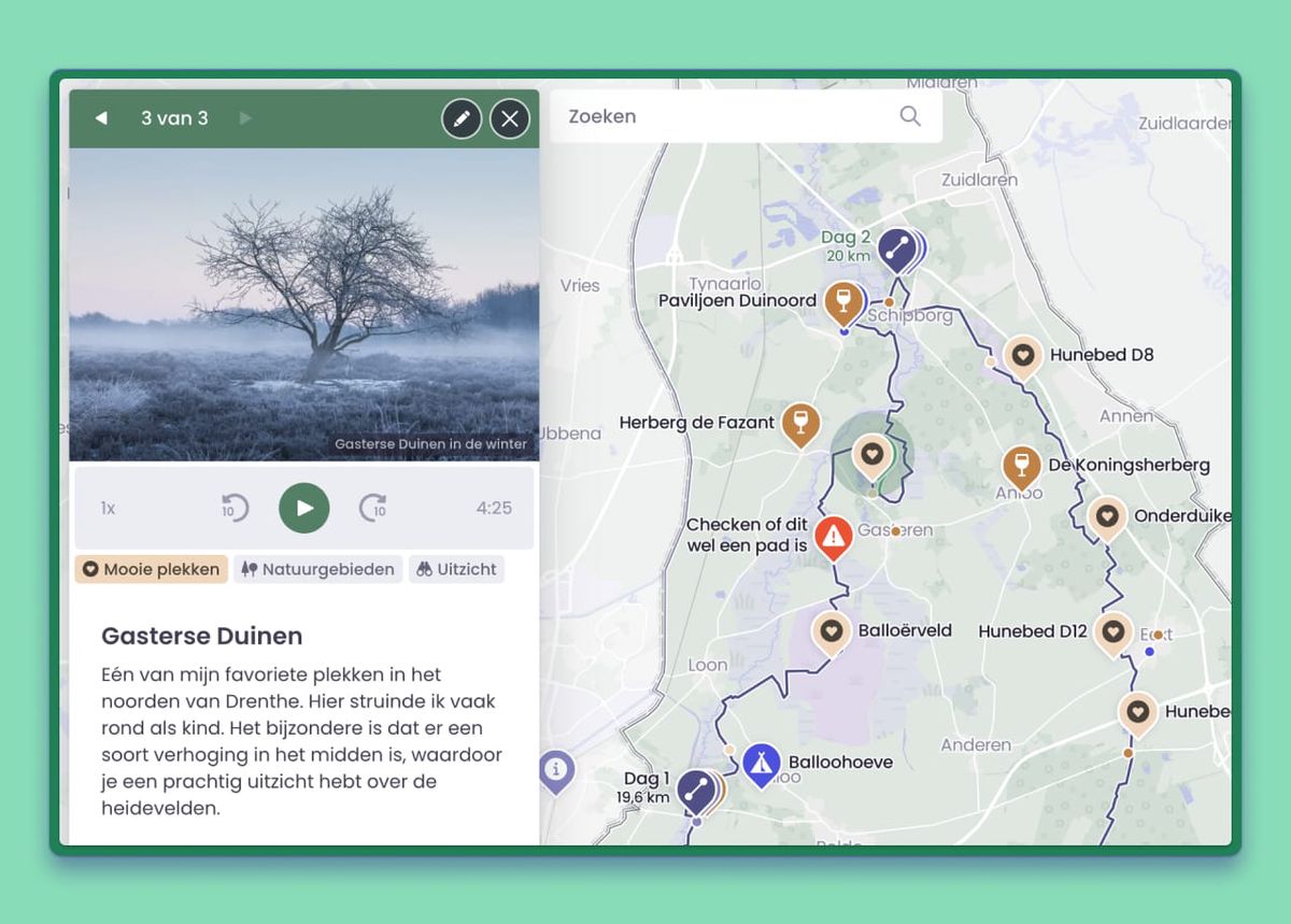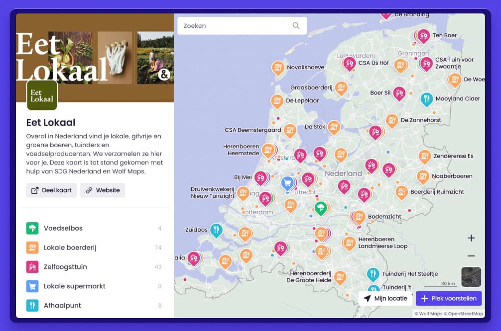Experience Route with AudioIn Wolf Maps, the environment comes to life – and sometimes you need your users for that. For example, when dealing with environmental management, a changing neighborhood, or simply because you value your target audience’s opinion. You can easily collect suggestions from your users. Just look at how Eet Lokaal does it. They now have an extensive interactive map featuring local, pesticide-free, and green farmers, gardeners, and food producers.